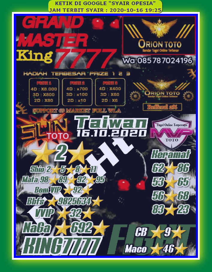 Syair taiwan adalah situs kode forum syair taiwan hari ini yang berisi prediksi taiwan serta bocoran taiwan malam ini jitu, akurat, tercepat. Forum syair taiwan malam hari ini berupa gambar prediksi dari berbagai macam syair seperti syair opesia, vip, omiframe, naga mas, jebret dan angka petir. Kode Syair taiwanpools Hari Ini Terlengkap. Gambar update per 5 menit sekali jadi kalian harus sering untuk cek forum syair taiwan hari ini atau kode syair taiwanpools hari ini terlengkap dari kami. Selanjutnya era sekarang ini syair-syair togel Menjadi salah satu apa ya namanya em semacam trawangan angka keluaran togel.